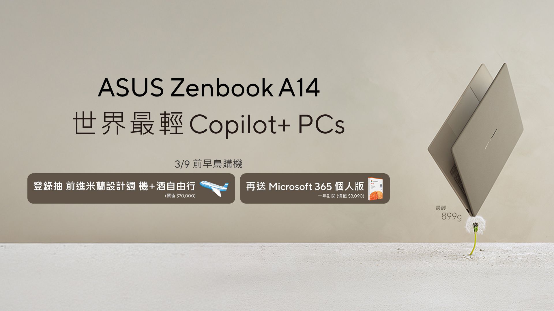 (2月10日,台北訊) 華碩於CES 2025發表多款矚目新品,在AI PC機海中以超凡質感脫穎而出的「雲朵機」ASUS Zenbook A14 (UX3407),輕如雲朵僅899克起,全機身採用高科技陶瓷鋁合金(Ceraluminum™),觸感溫潤,具備防刮、抗磨損及防汙能力,提供沙暮金與冰岩灰兩款典雅配色[1],詢問度居高不下。搭載高效的Snapdragon® X系列處理器,内建直覺且易用的AI功能,讓生活更加多采多姿。2月10日起,華碩高通處理器機種獨享三年原廠保固,購機更安心!建議售價:NT$39,999起,了解更多:世界最輕Copilot+ PC[2]—ASUS Zenbook A14 (UX3407)。3月9日前,早鳥預購ASUS Zenbook A14 (UX3407),登錄送「Microsoft 365個人版一年訂閱(價值NT$3,090)」,加碼再抽「米蘭機票加住宿自由行」(價值NT$70,000),有機會前進2025米蘭設計週-ASUS DESIGN YOU CAN FEEL特展共襄盛舉,活動詳情請參考:Zenbook A14早鳥預購登錄送